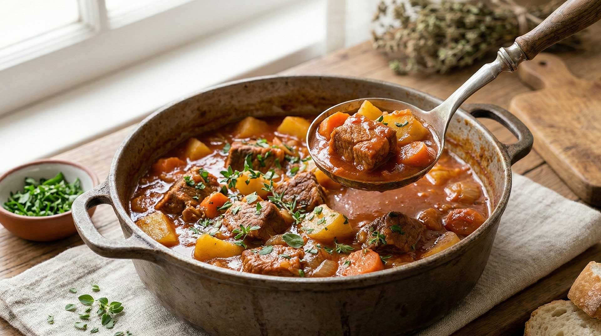 Cocción lenta: Añade las zanahorias, las papas, el laurel y el tomillo. Cubre con caldo o agua.
