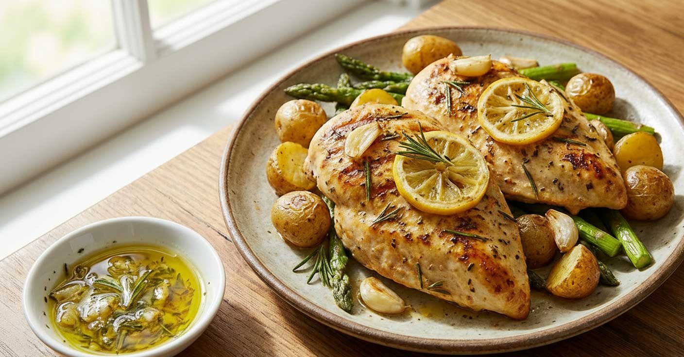 Marinar: En un bol, mezcla el pollo (entero o en filetes gruesos) con el jugo de limón, la mitad del ajo, el romero y un chorrito de aceite. Deja reposar 10 minutos.